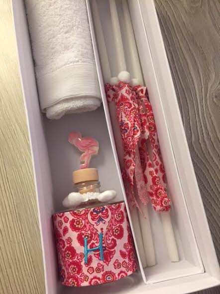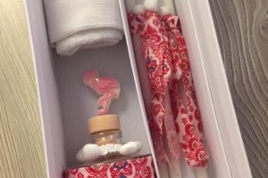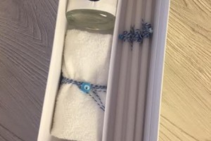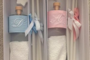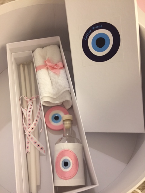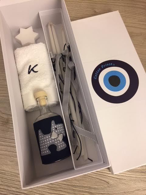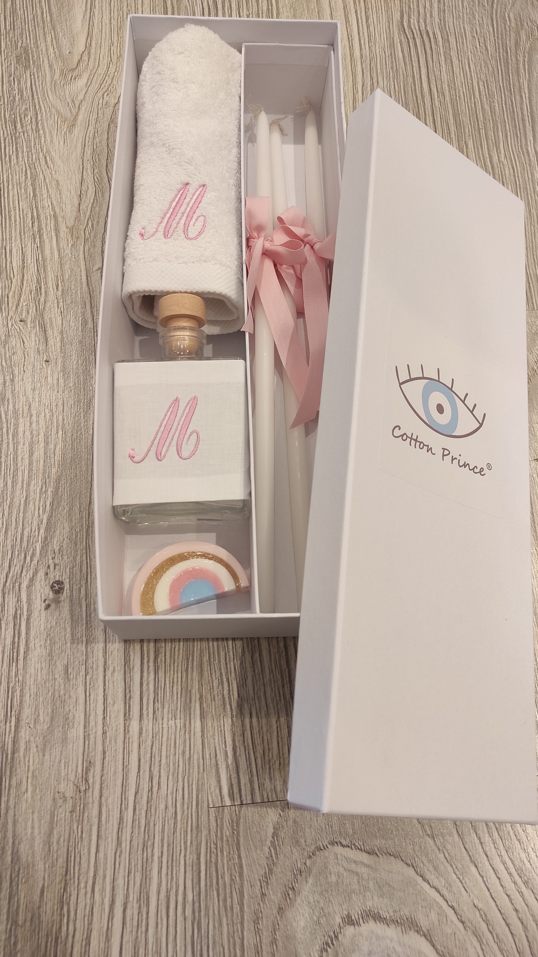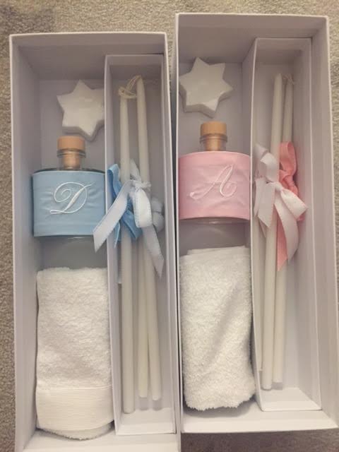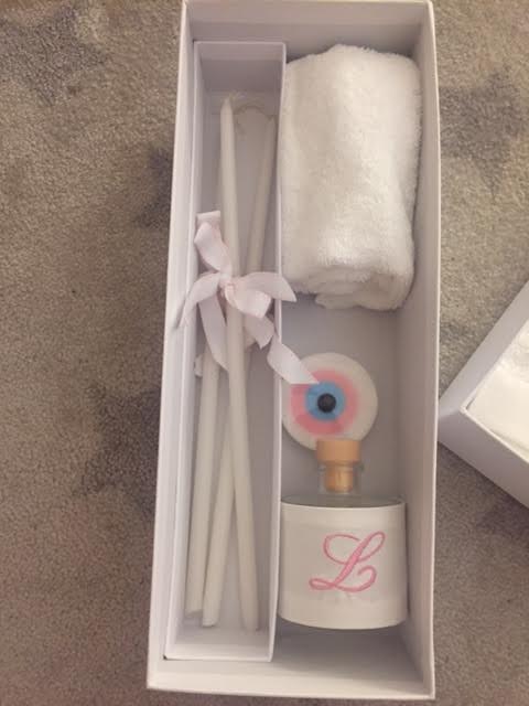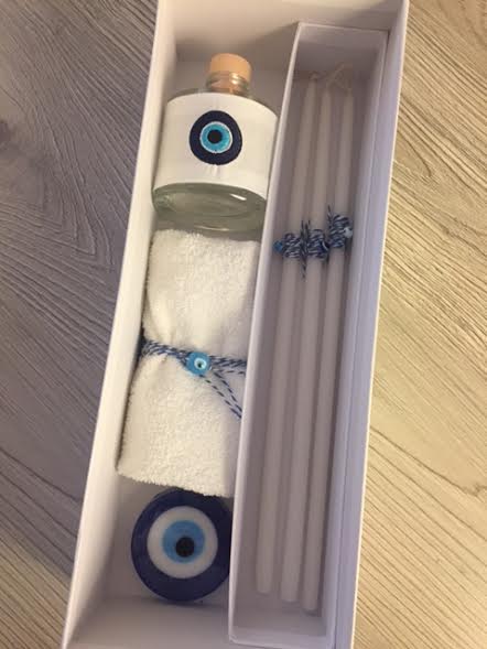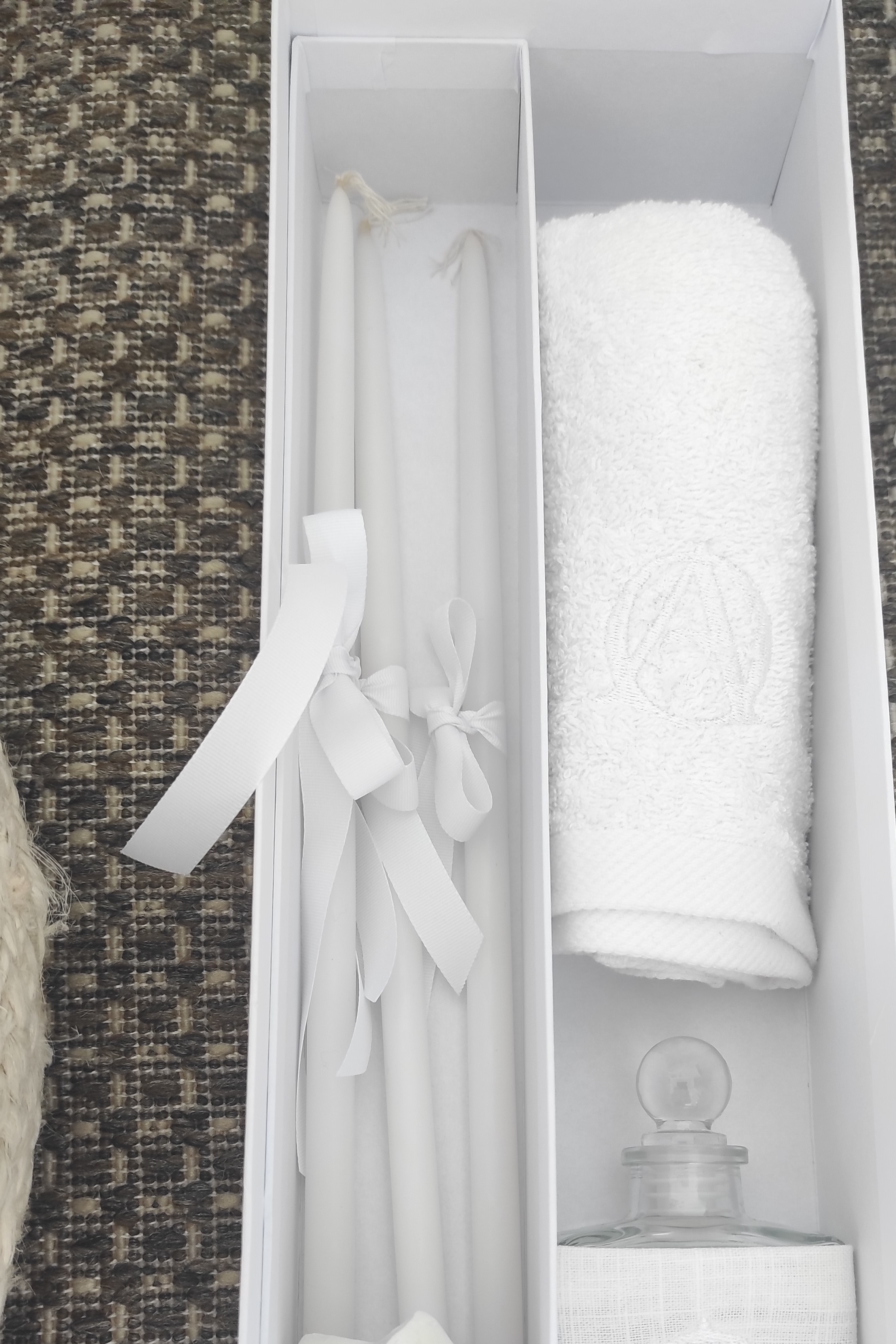 the set includes the oil bottle, the hand towel, the soap and the 3 baptistry candles