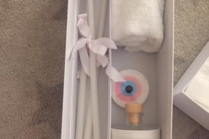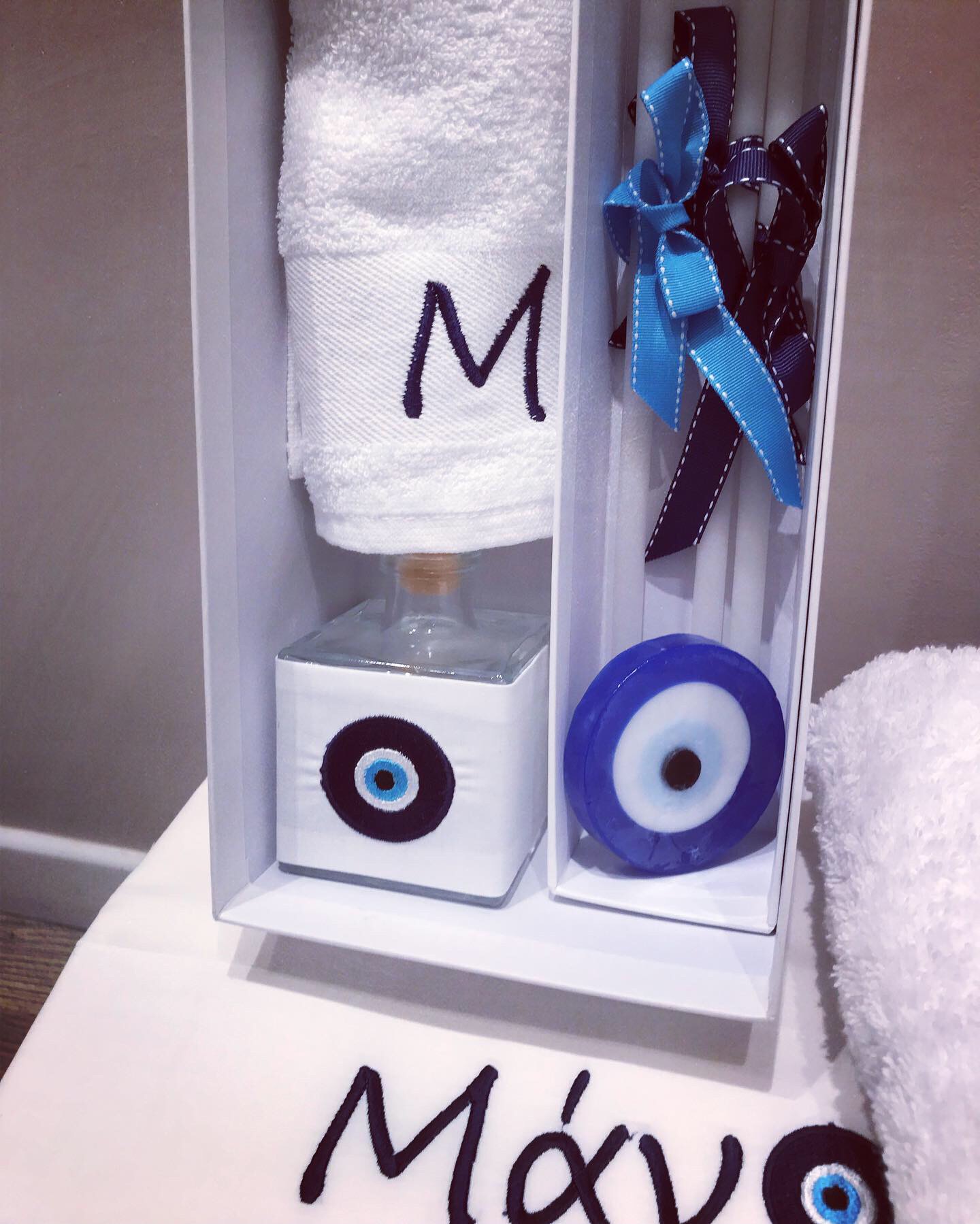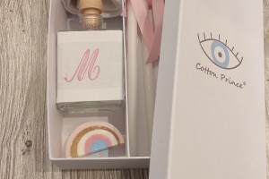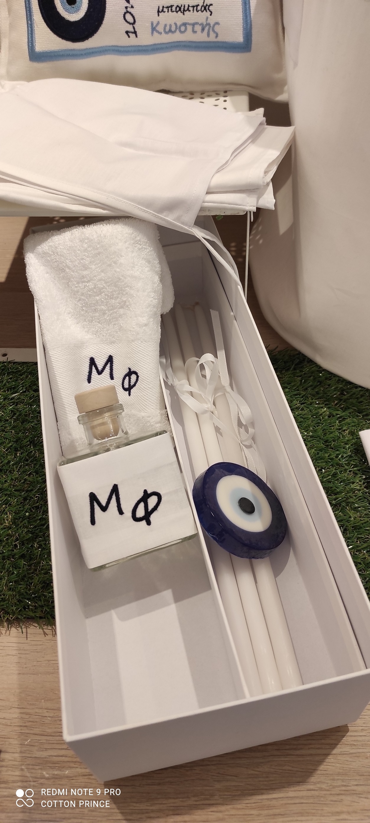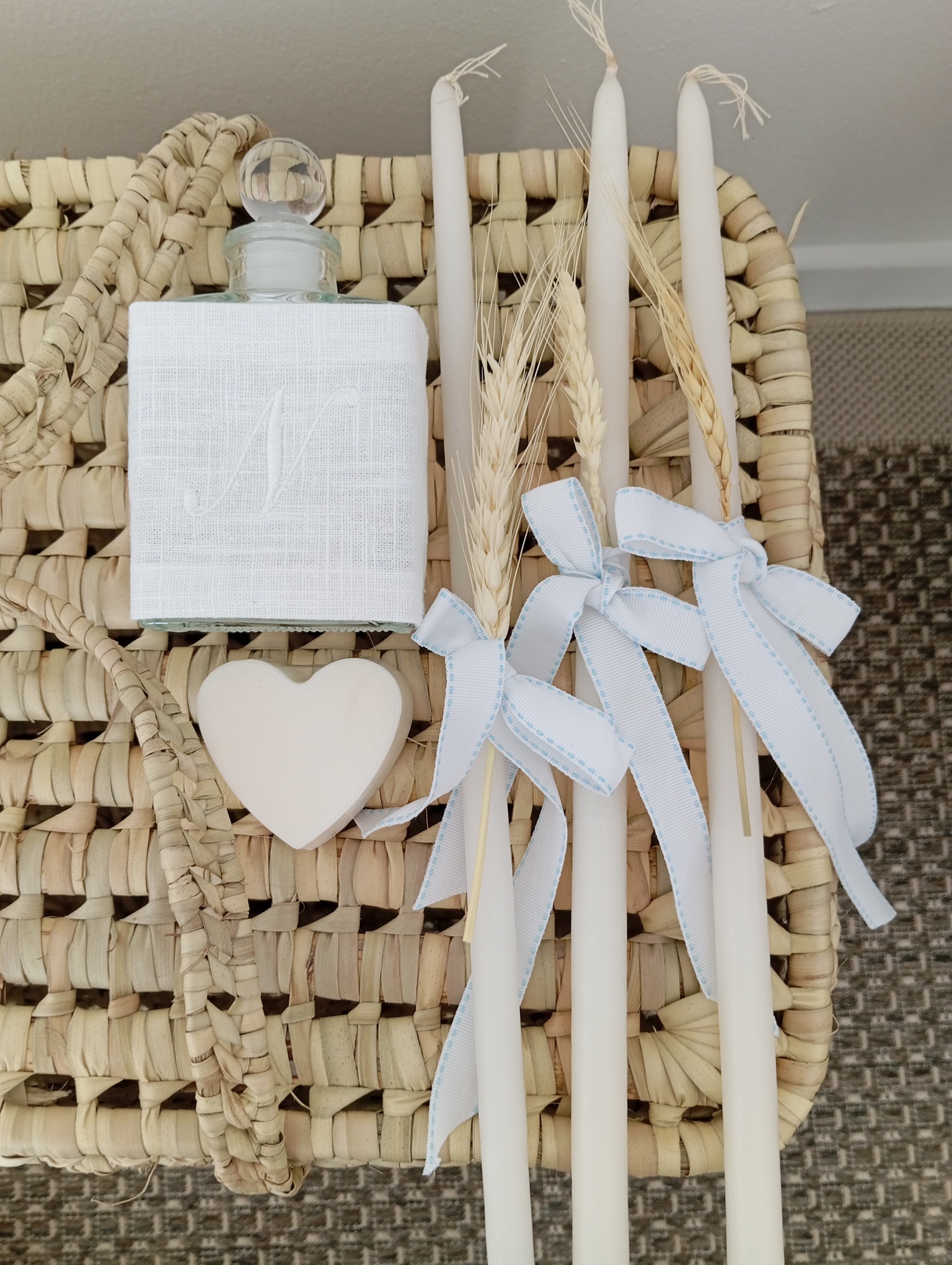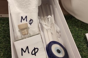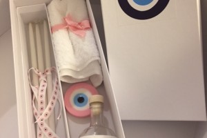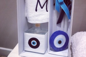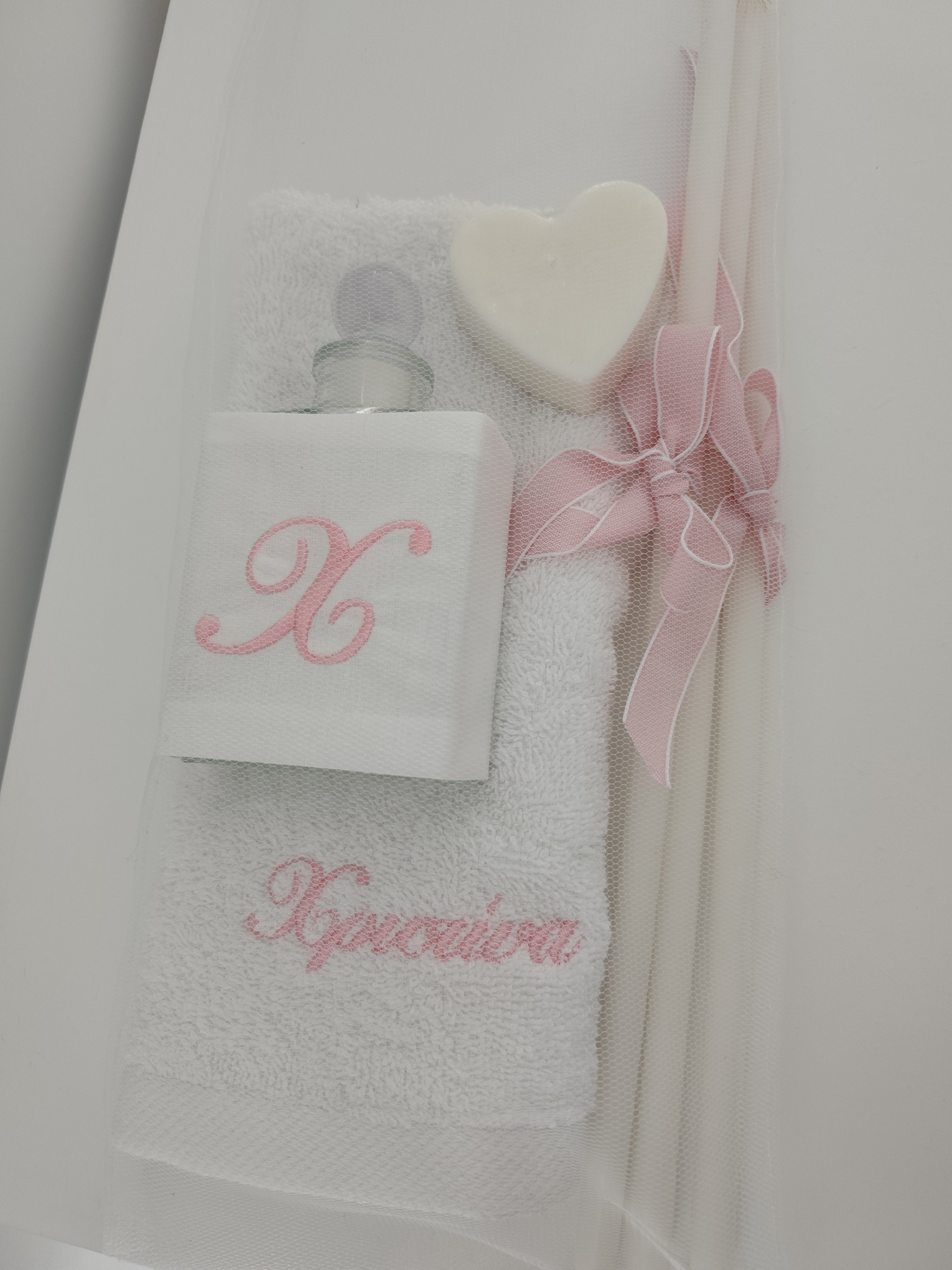 the set includes the oil bottle, the hand towel, the soap and the 3 baptistry candles