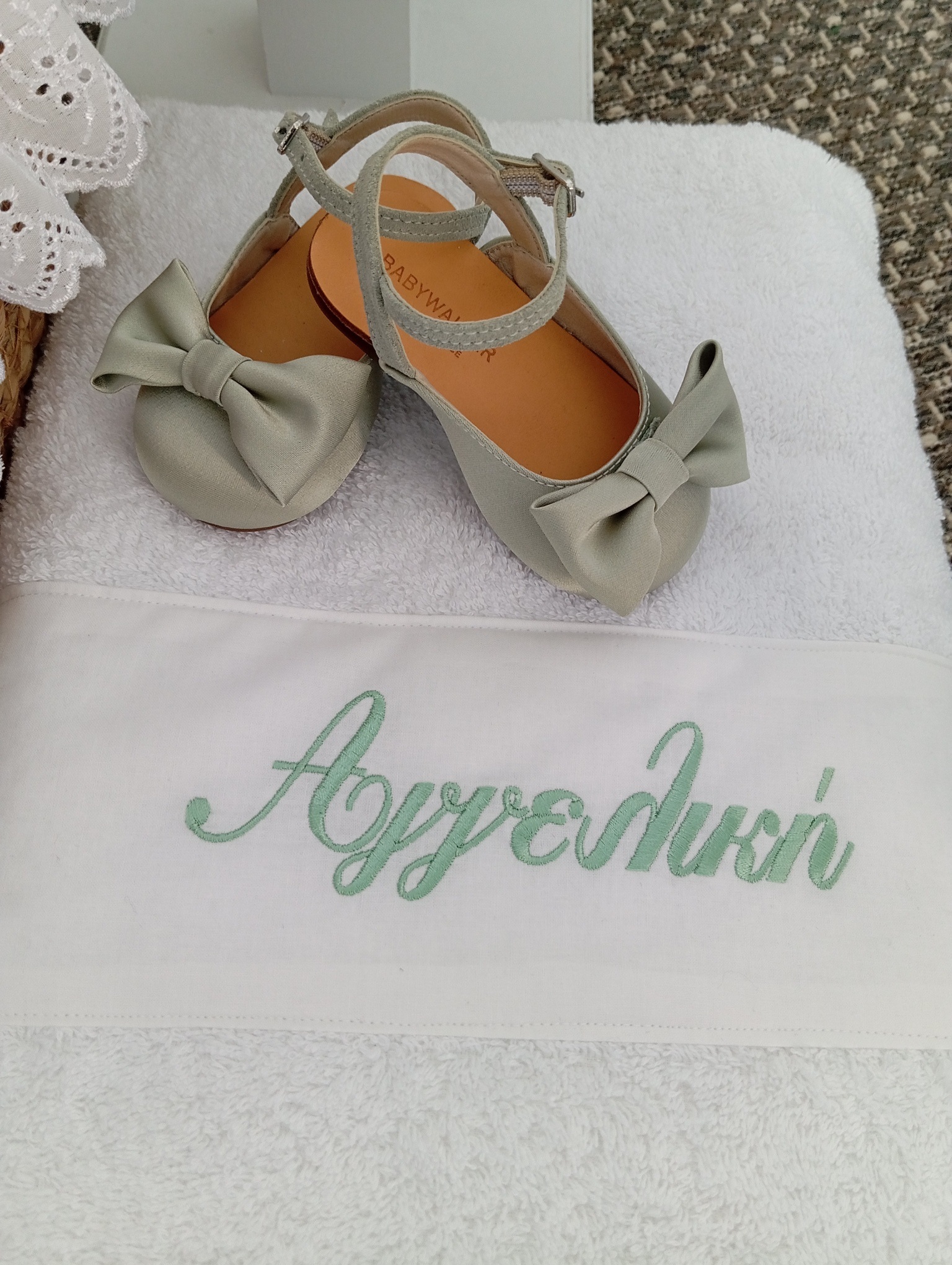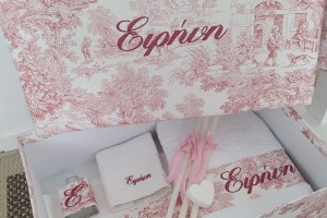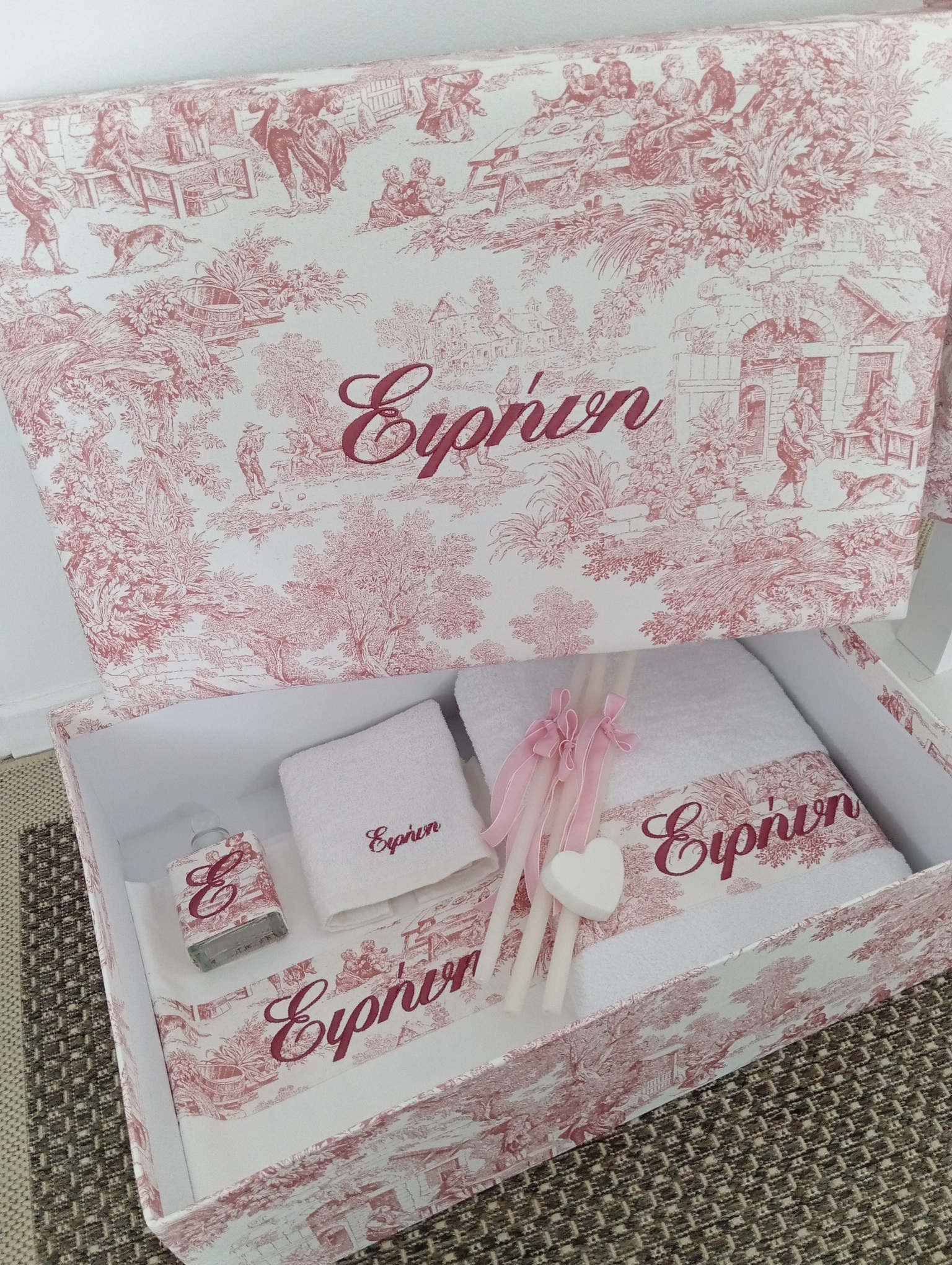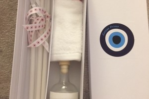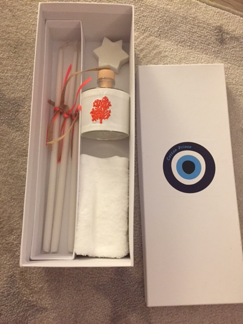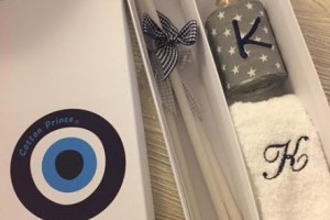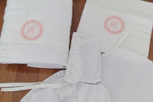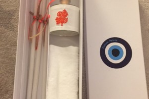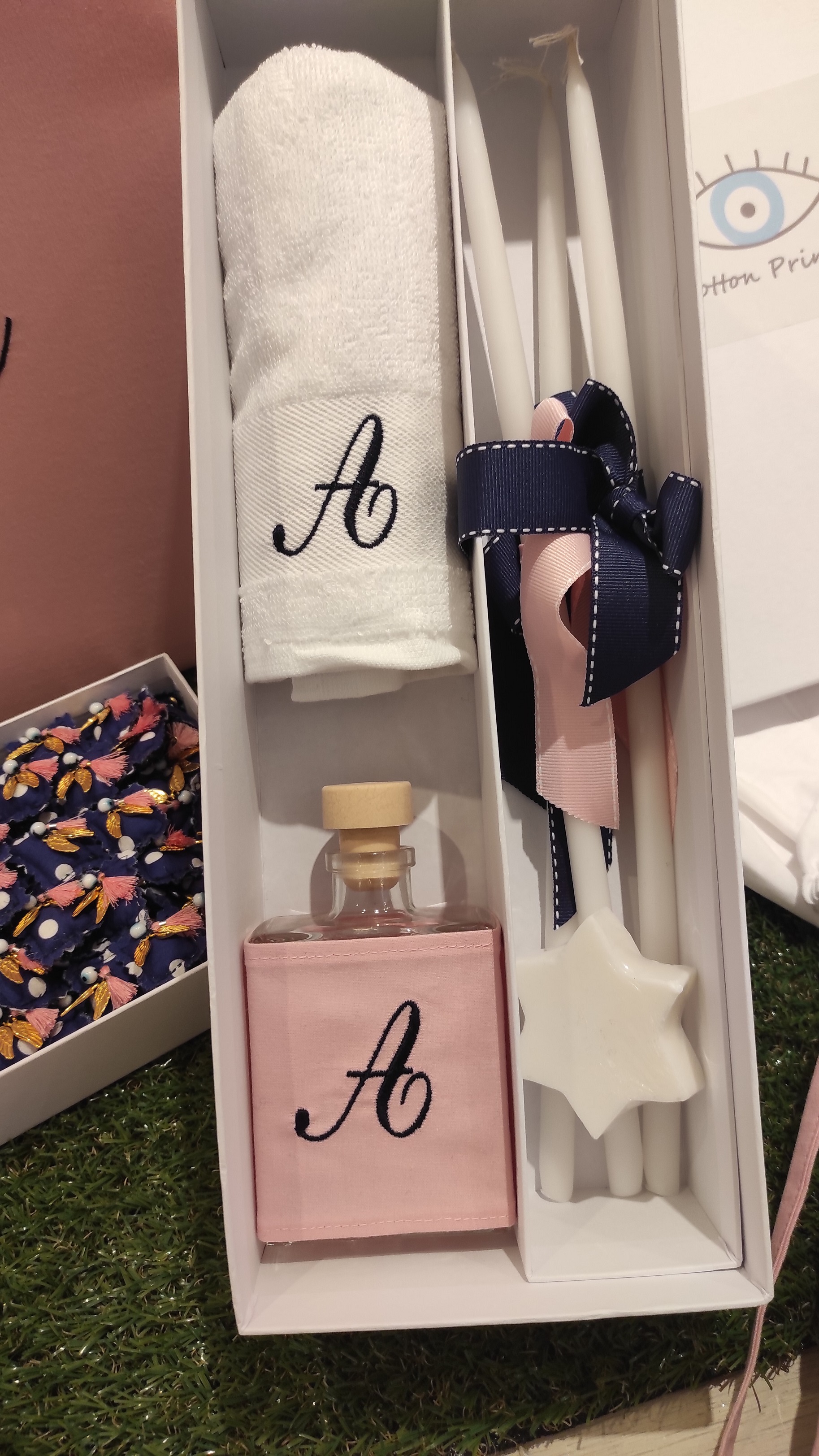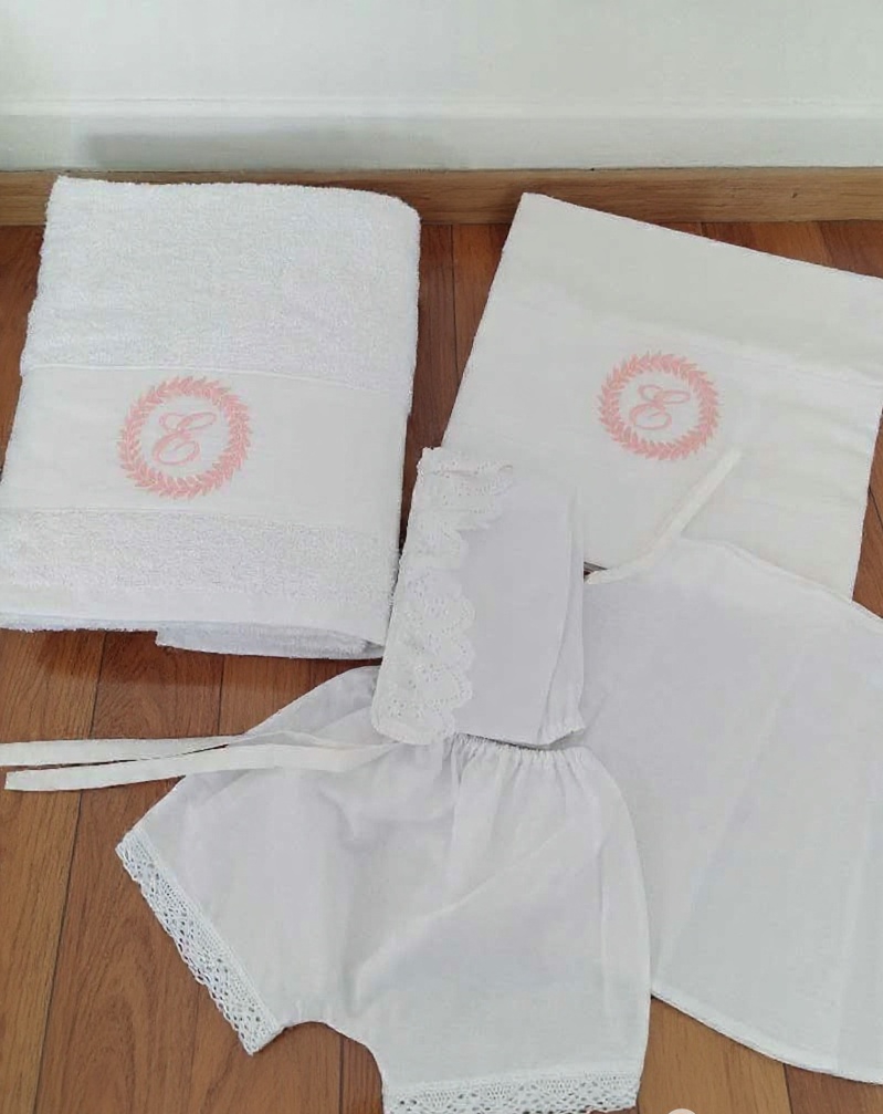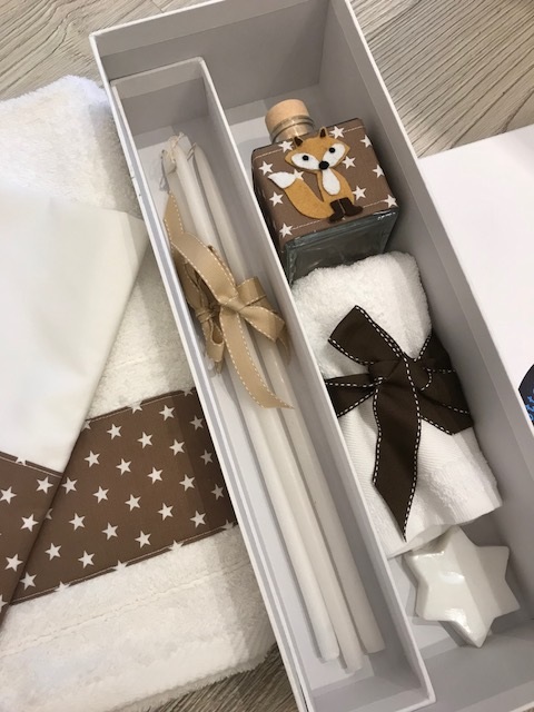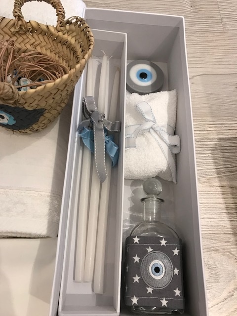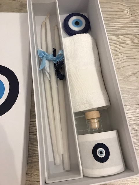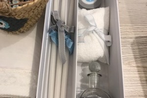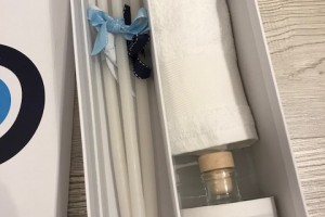 the set includes the oil bottle, the hand towel, the soap and the 3 baptistry candles