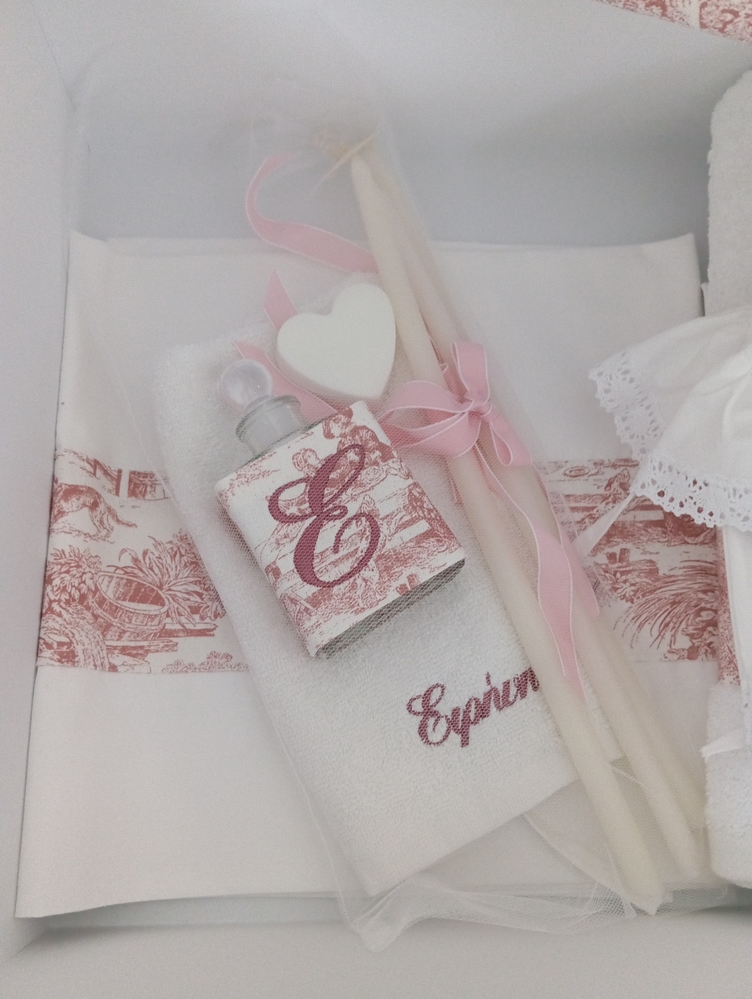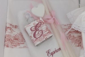 the set includes the oil bottle, the hand towel, the soap and the 3 baptistry candles
